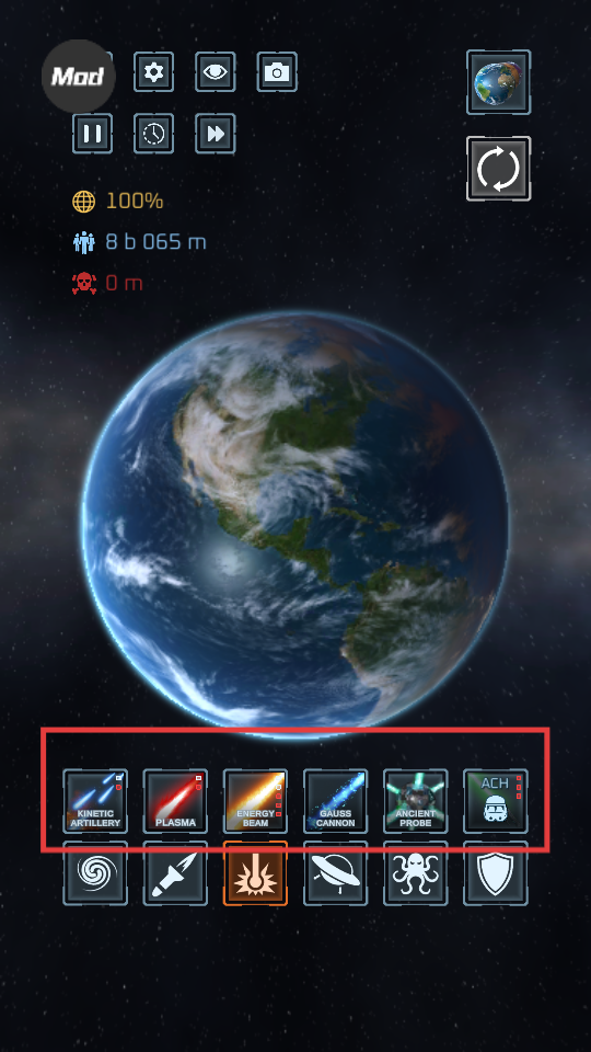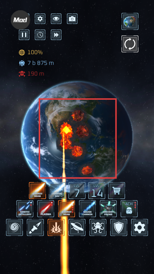 4、使用选定的武器,如【ENERGY-BEAM】)攻击行星,观察行星受到攻击后的效果,推进游戏进程。