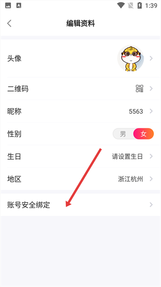 2、进入编辑资料界面,找到并选择【账号安全绑定】选项。