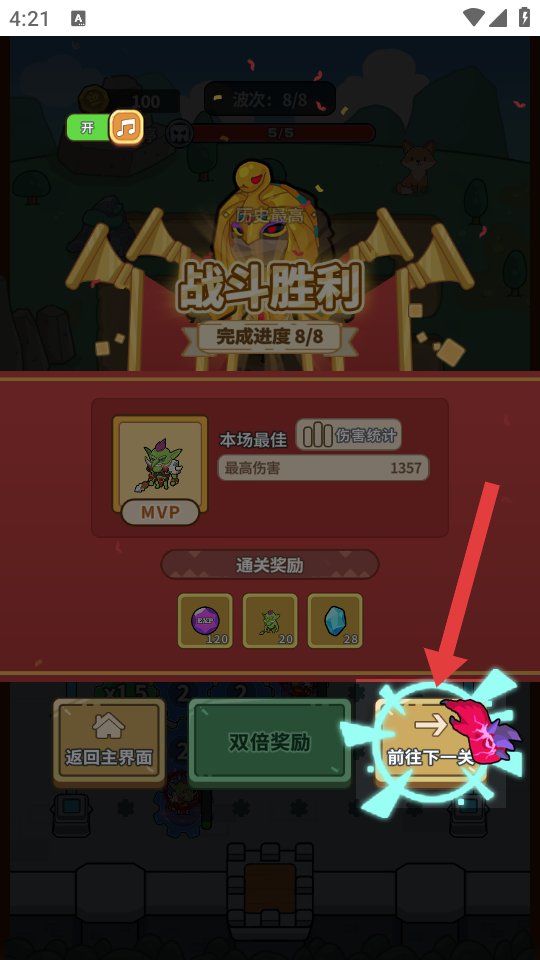 4、成功抵御所有敌人后,在“战斗胜利”界面,点击【前往下一关】,继续挑战新关卡。