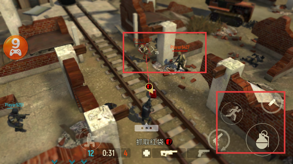 3、在场景中留意敌人,利用右侧攻击按钮,尝试抓取红袋并与敌人对抗。