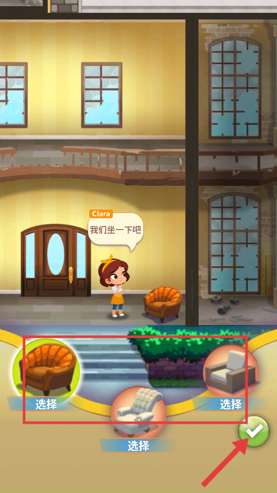 4、选择喜欢的椅子样式,点击绿色对勾按钮,完成椅子的布置,推进游戏剧情。