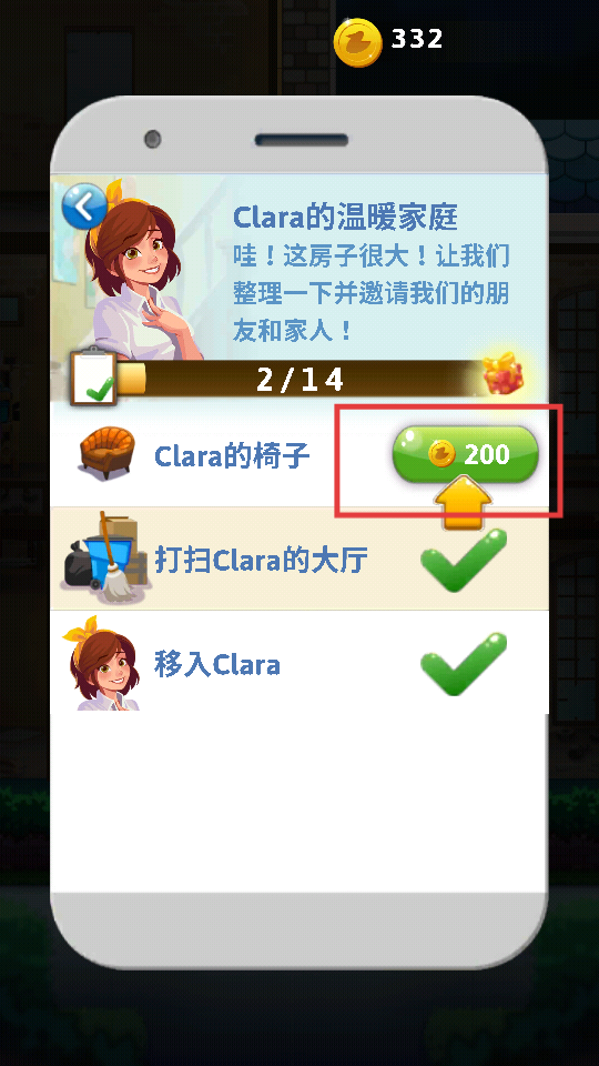 3、在任务界面,点击花费200金币的按钮,解锁【Clara的椅子】,提升任务完成进度。