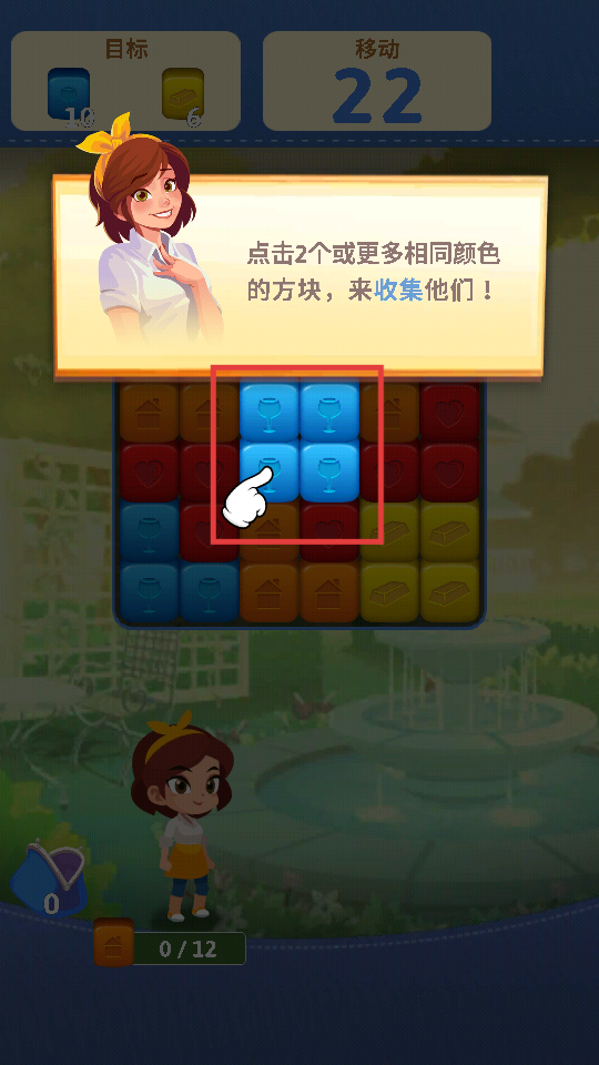 1、根据提示,点击2个或更多相同颜色的方块,收集它们,开始推进关卡。