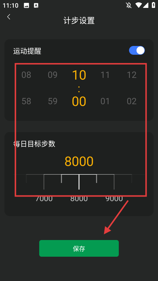 3、调整运动提醒时间和每日目标步数,点击【保存】。