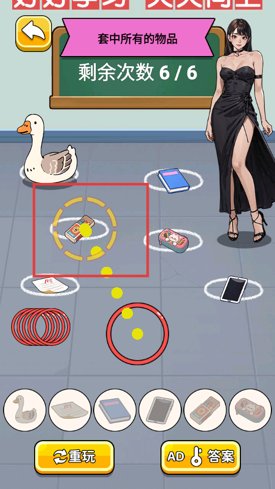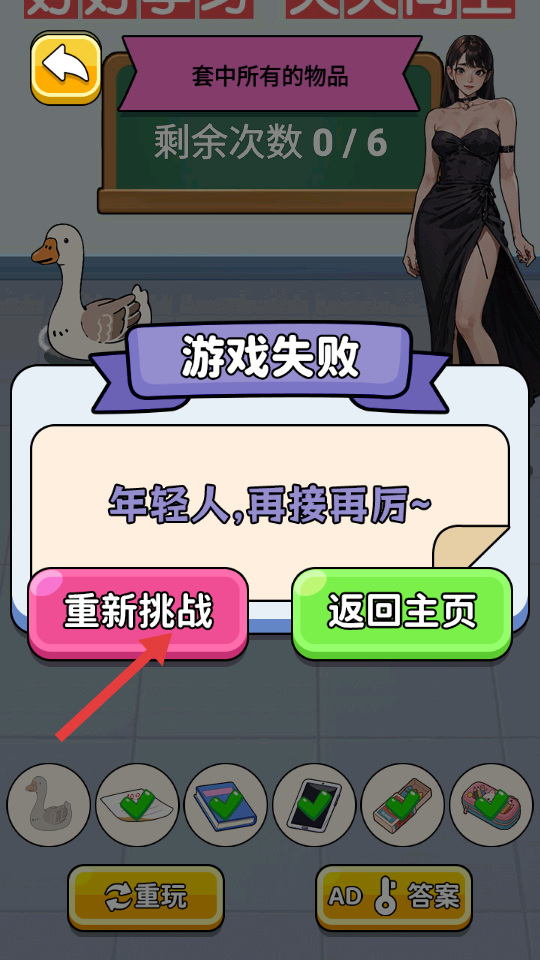 4、若游戏失败,点击【重新挑战】按钮,再次尝试套中所有物品。