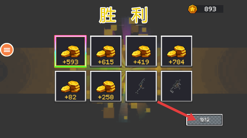 4、击败怪物获得胜利后,点击【继续】按钮,领取金币和武器奖励。
