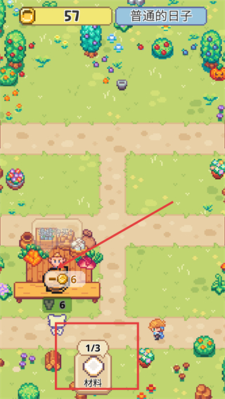 4、采购食材后,收集材料,关注材料收集进度1/3,逐步积累材料用于餐厅的餐品制作或设施升级。