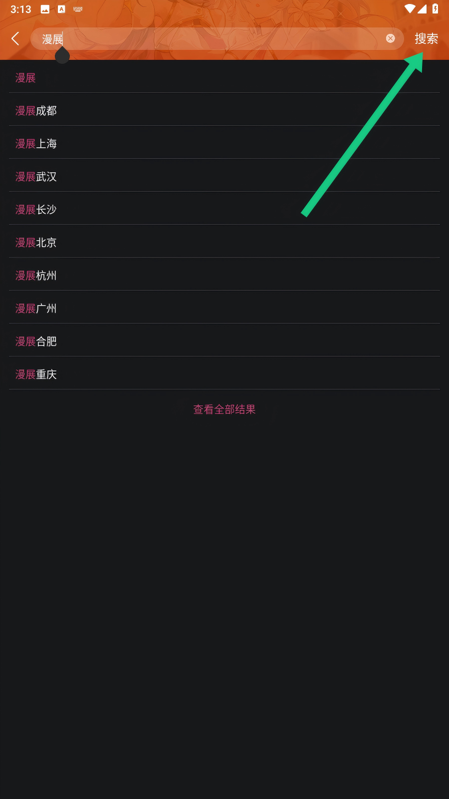 2、输入【漫展】这类关键词后,会弹出各地漫展的推荐,挑选想去的城市漫展,再点击【搜索】按钮吧。