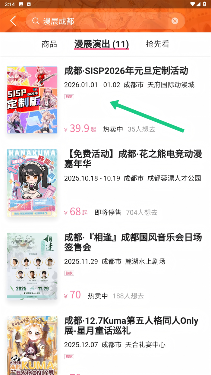 3、搜索后进入漫展演出列表,点进去查看详情,里面有时间、价格等信息呢。
