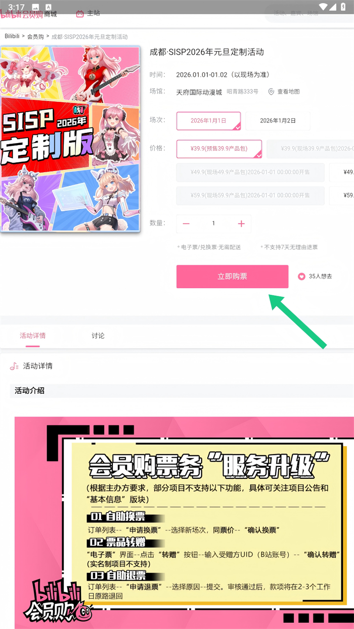 4、到活动详情页,选好场次等,确认信息无误后,点击【立即购票】按钮,就能顺利完成购票啦。