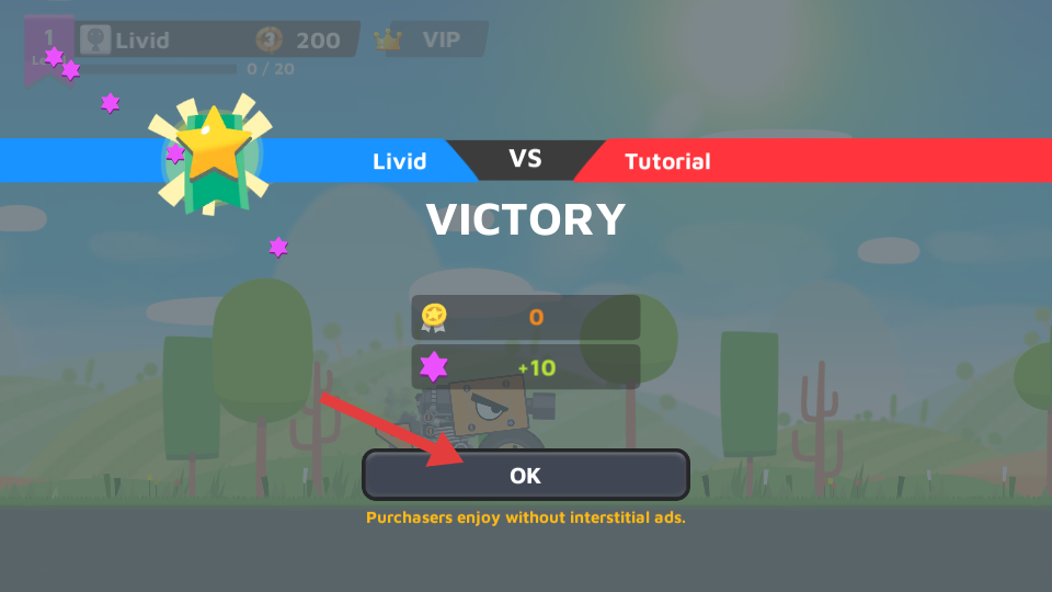 4、战斗胜利后,界面显示【VICTORY】,点击【OK】按钮,结算奖励并继续游戏。