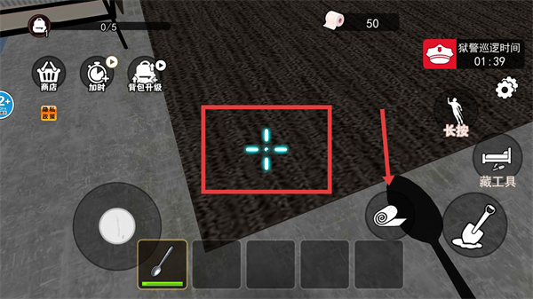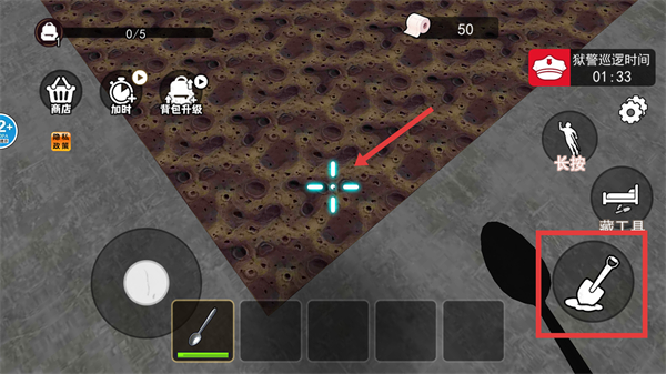 4、将地毯掀起后,在挖掘点,点击红色箭头指向的【铲子】道具,开始挖掘地牢,推进逃生进度。