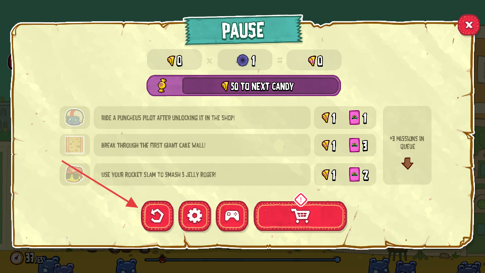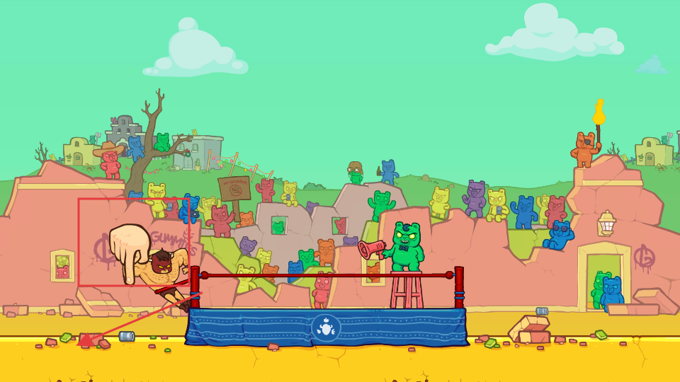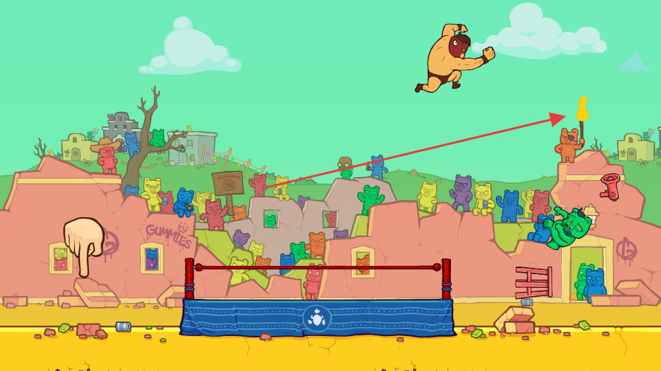 2、在摔跤场中,点击屏幕蓄力,将BurritoBison弹射出去,利用弹射力穿越软糖障碍物,尽可能飞远。