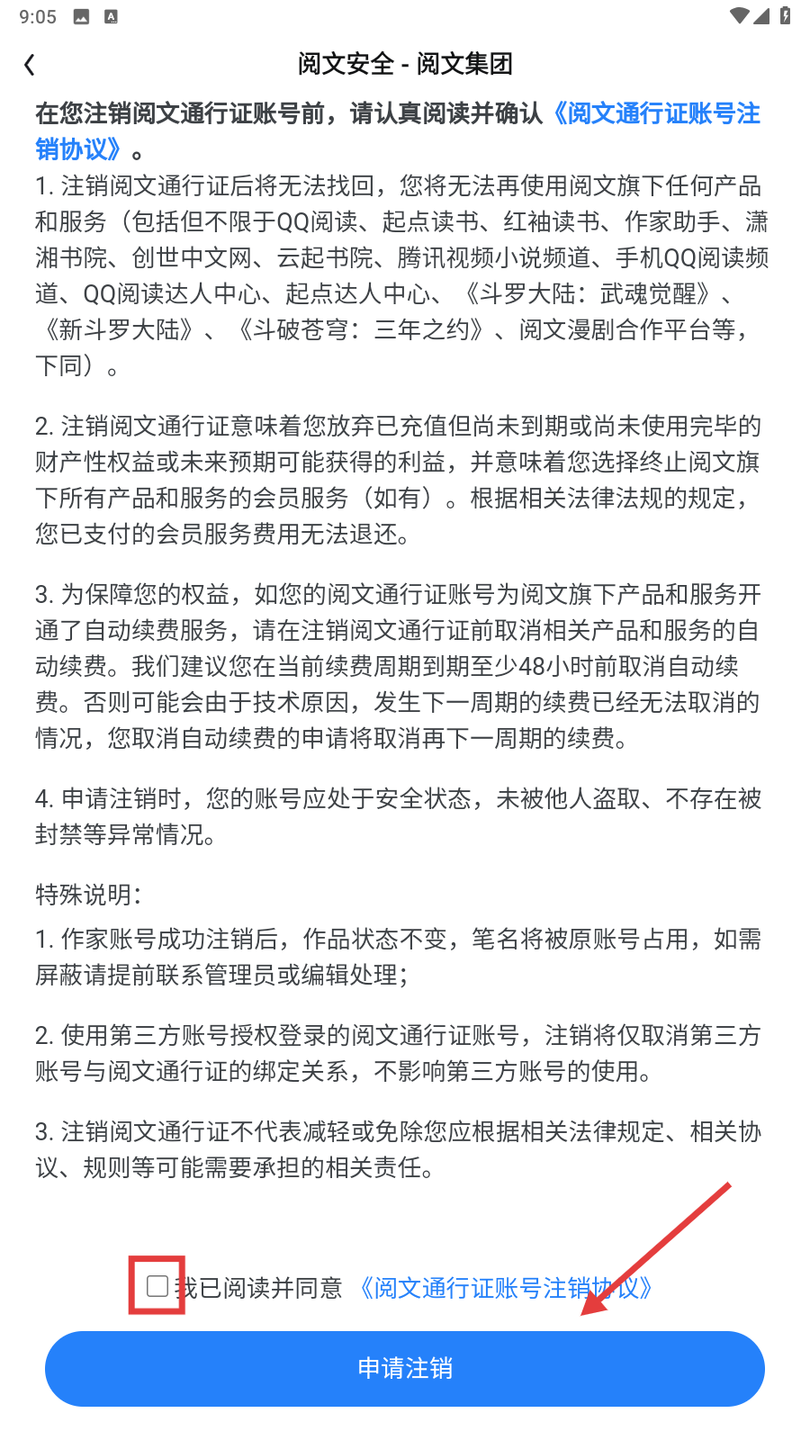 4、接着认真阅读【阅文通行证账号注销协议】,勾选同意后点击【申请注销】,便可提交注销申请啦。