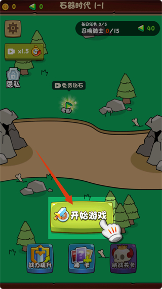 1、在游戏主界面,点击【开始游戏】按钮,进入【石器时代-1-1】关卡,开启游戏挑战。